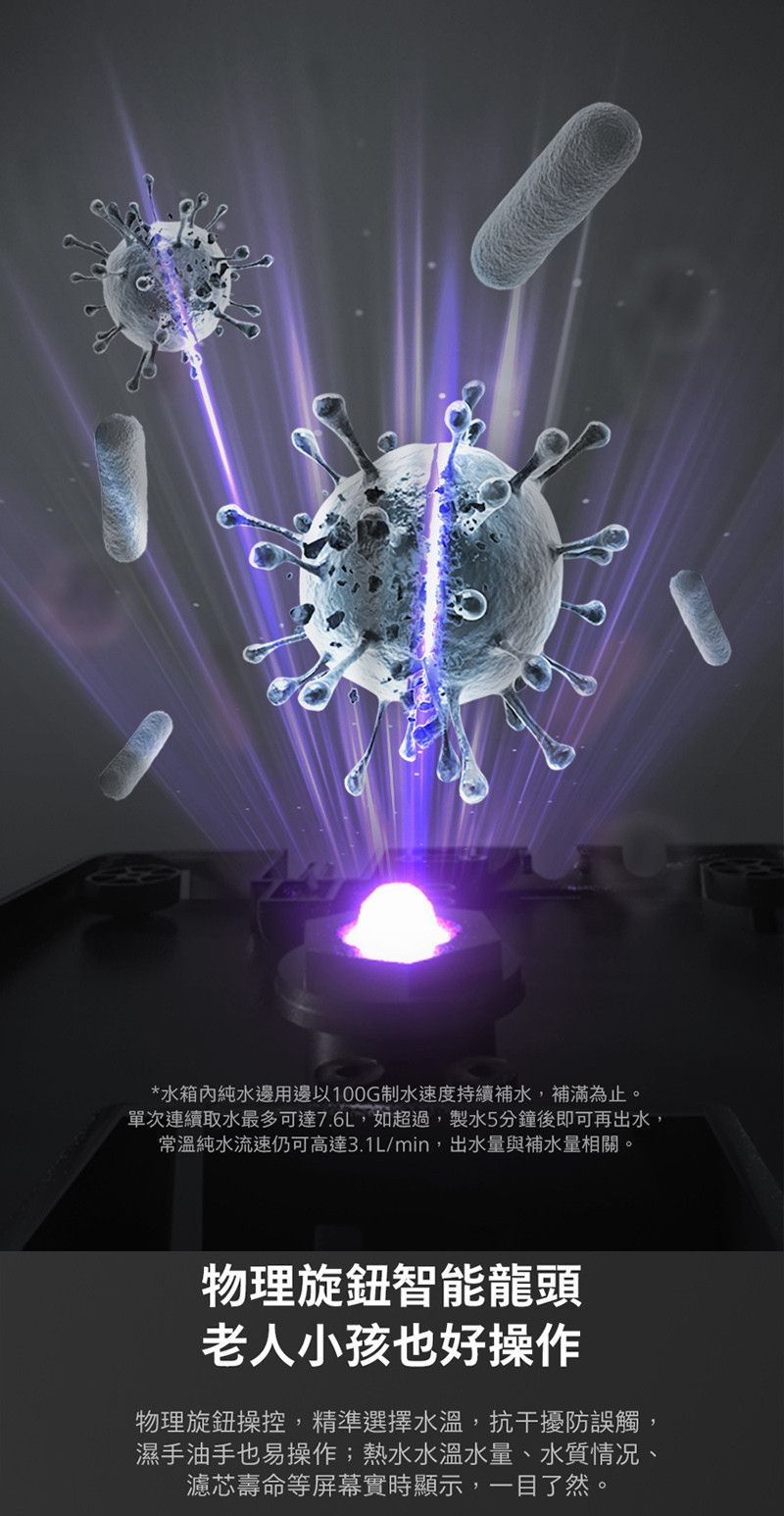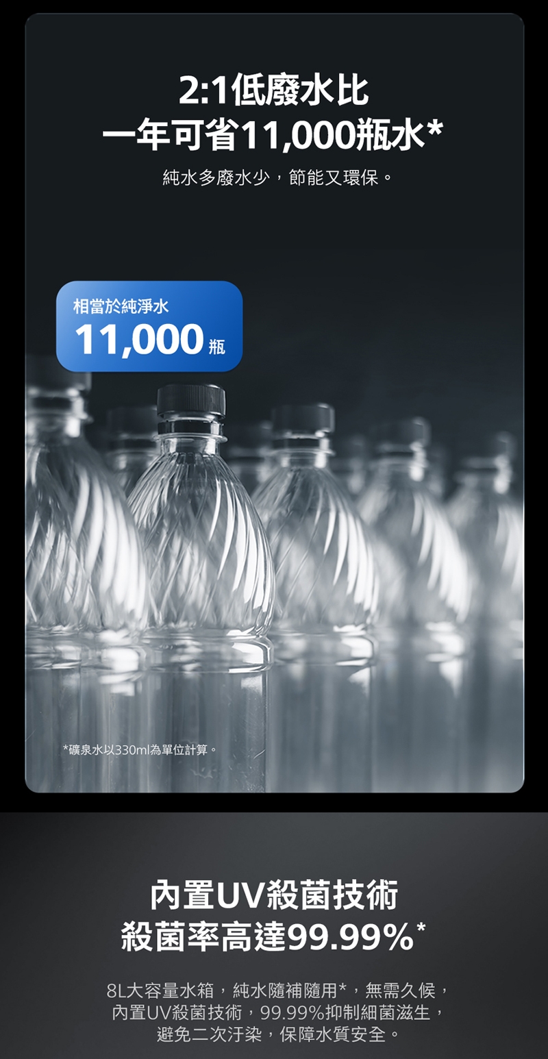內置 UV 紫外線殺菌模組,殺菌率高達 99.99%,搭配 8L 大容量水箱,隨取隨用