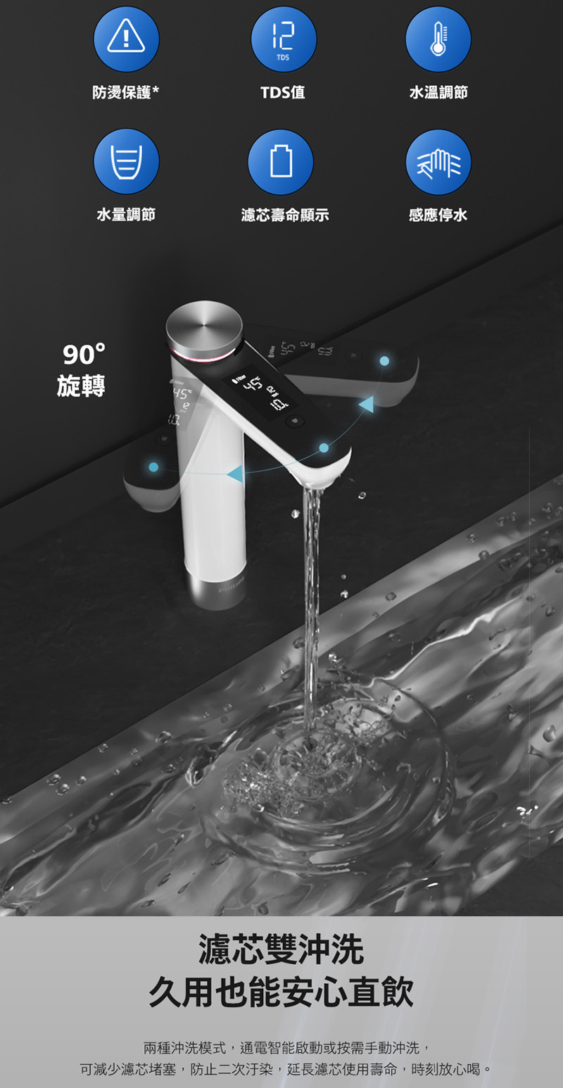 搭配螢幕實時顯示 水溫、水量、水質(TDS 值)、濾芯壽命等