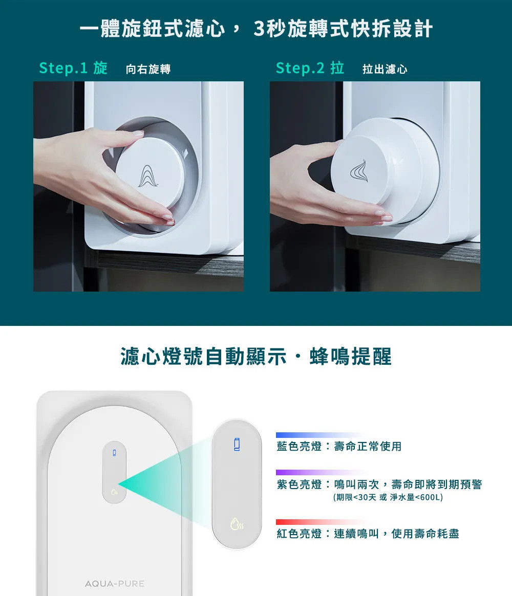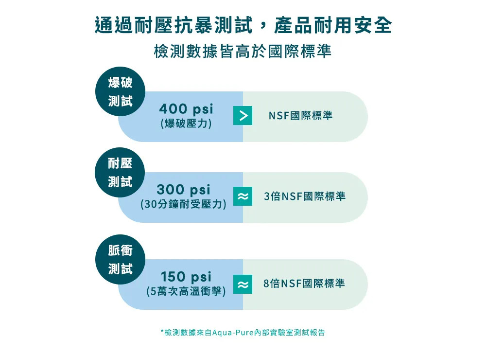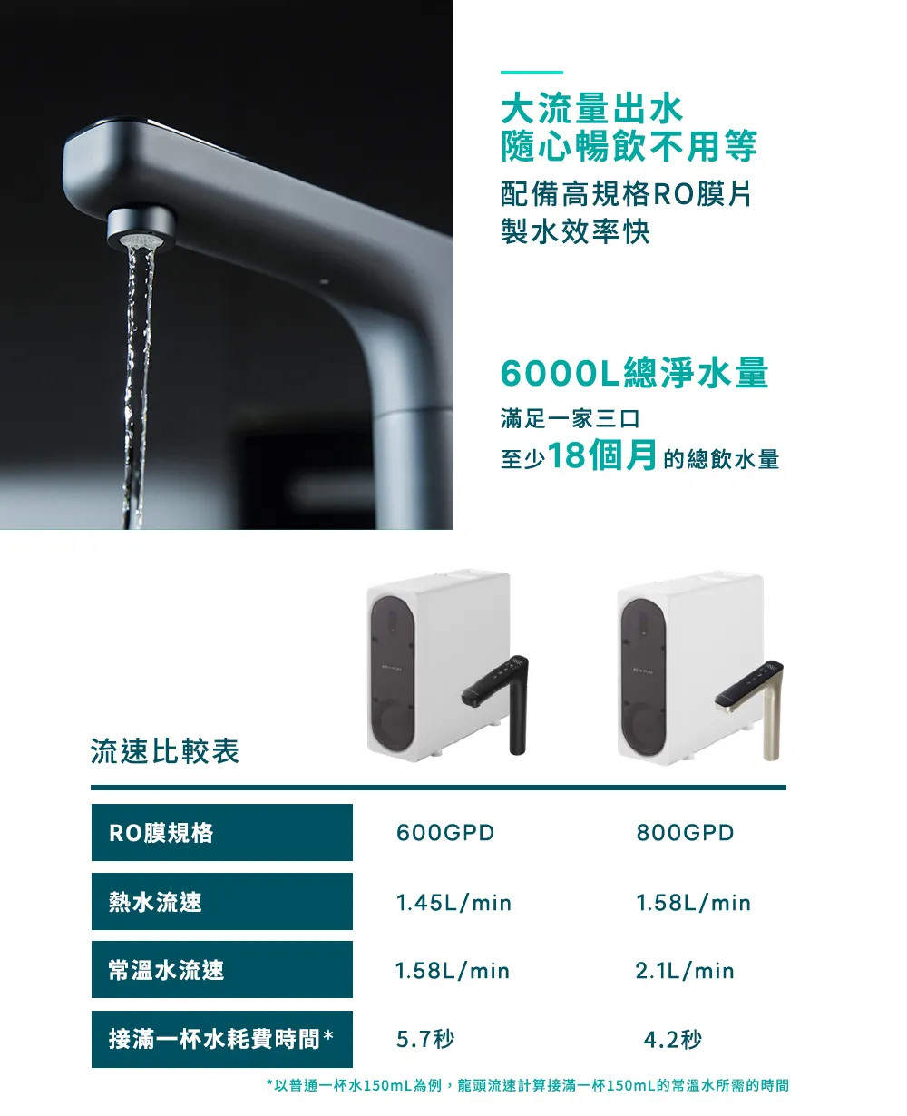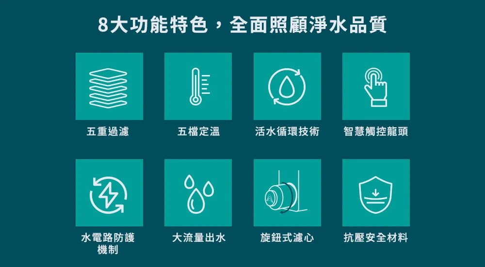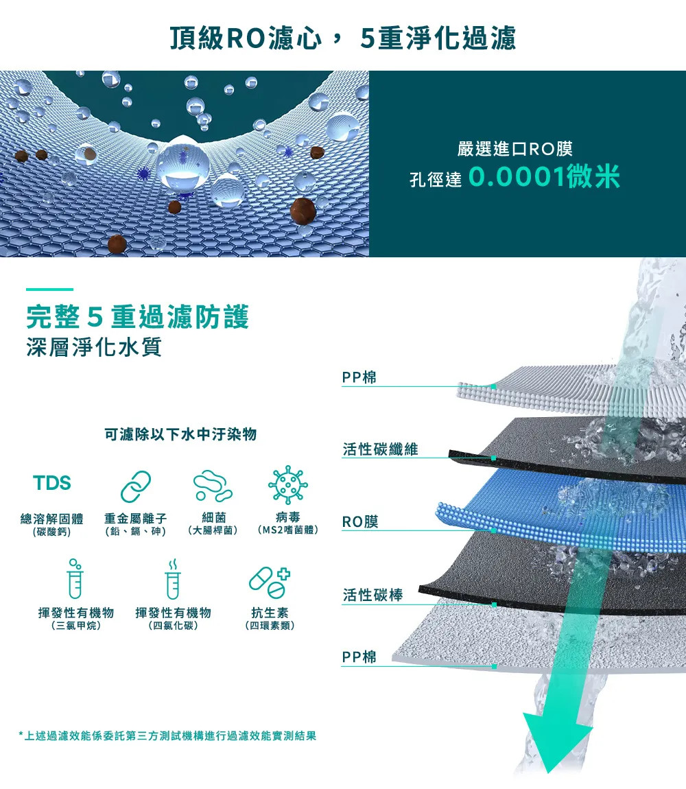 五重濾材層層過濾 搭配600GPD RO膜,高效去除水中汙染物。