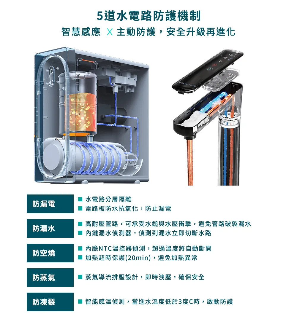 五道安全防護機制 防漏電、防漏水、防空燒、防蒸氣、防凍裂。