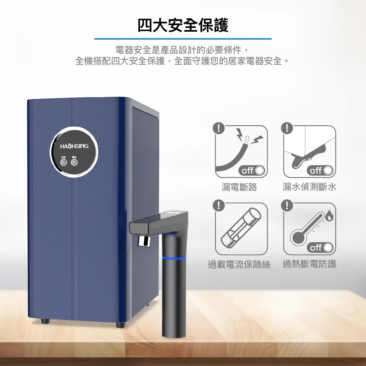 搭載四大安全保護機制: 漏電斷路、漏水斷水、過載電流和過熱斷電保護
