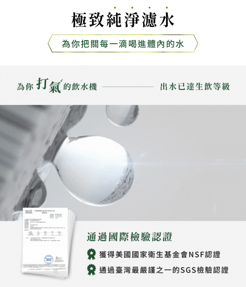 【極純淨】生飲級淨水,通過美國NSF及台灣SGS檢驗及認證