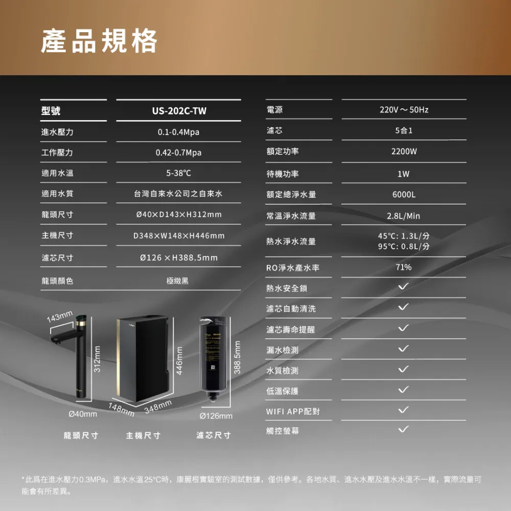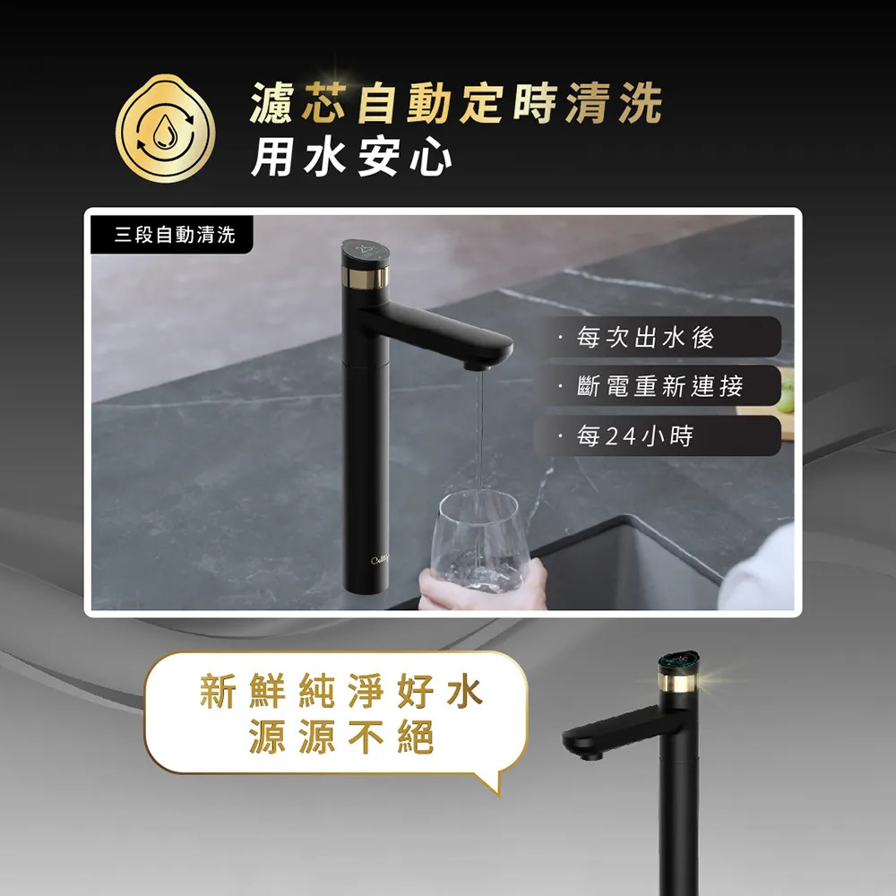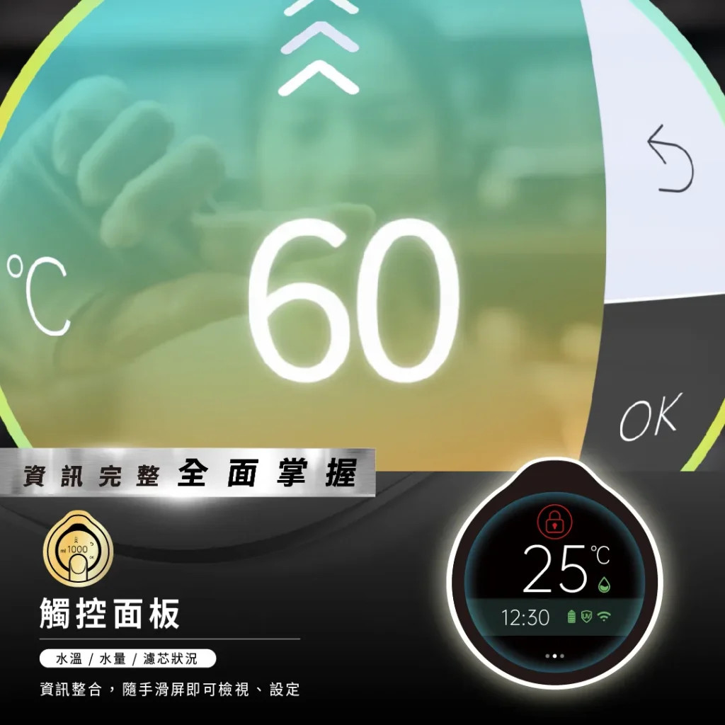 高質感觸控龍頭:使用直覺旋鈕操作,消光黑金屬質感與全觸控液晶螢幕可控制水量與水溫,並可透過WIFI聯網,在APP上進行更詳細的設定與檢視用水狀態在外觀和使用介面上都非常吸引人